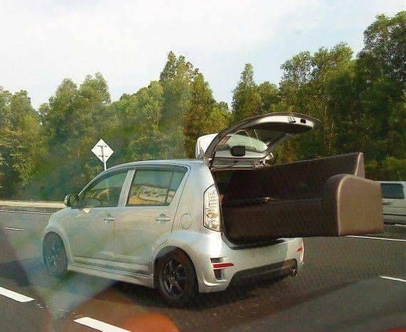 Kereta jenis yang sama, saiz yang sama. Tetapi muatan yang berbeza. Kenapa bayar lebih untuk lori muatan kalau ada Myvi? Dah macam iklan Trivago kan? Ha… Itulah kehebatan lain sang Myvi. Selain boleh memuatkan manusia, ia juga mempunyai kapasiti untuk membawa sofa panjang, 5 ekor kambing, seekor kerbau serta sebuah motosikal.