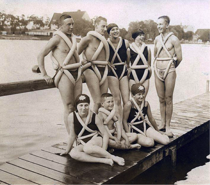 The modern swimming float uses the same theory as the early-day ‘revolutionary’ invention, but today’s version is less comical looking yet still functions the same.