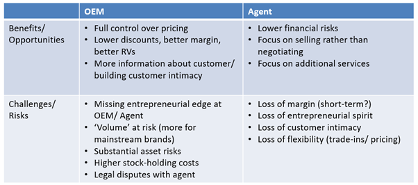 Under the agency model, the risk is mostly at the OEM level, with assets (cars) being held by them. But they can then control prices and any discounts and lower margins given away and, of course, they build the direct relationship with the customer. Many franchised dealers are not happy with the fact that they will become a mere intermediary.