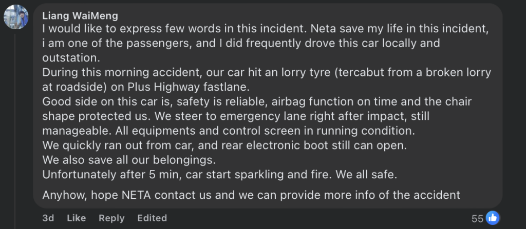 One of the passengers that was involved in the incident, Liang WaiMeng, took Facebook to explain what happened. According to him, they stopped the car on the emergency lane after the impact. About 5 minutes after clearing the car, it started to catch fire.