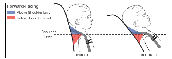 3c. In a forward-facing seat, the points where the straps are attached to the car seat should be at or above the shoulders. This will prevent the torso from moving forward too much in the event of a crash.