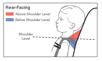 3b. In a rear-facing seat, the points where the straps are attached to the car seat should be at or below the shoulders of the child. This way, if the car is in a crash, the straps will prevent the child from sliding towards the front of the vehicle.
