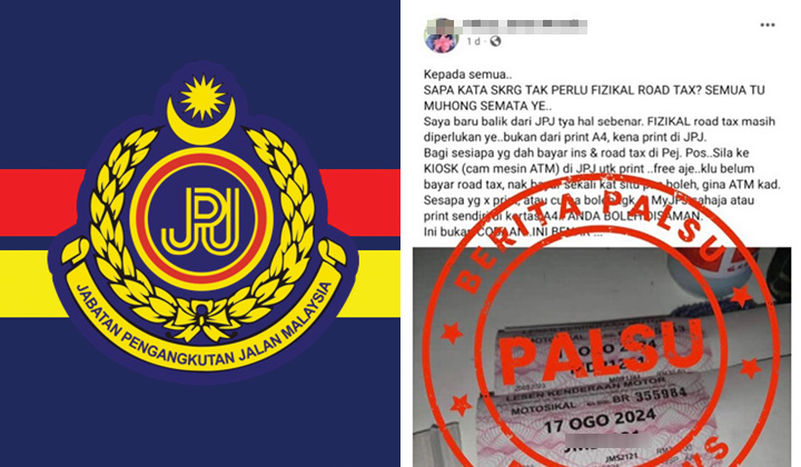 “Siapa kata sekarang tak perlu cukai jalan fizikal. Semua itu bohong semata. Saya baru balik dari JPJ tanya hal sebenar. Cukai jalan fizikal masih diperlukan ya. Sesiapa yang dah bayar insurans dan cukai jalan di pejabat pos sila ke kiosk di JPJ untuk cetak, ia percuma.”