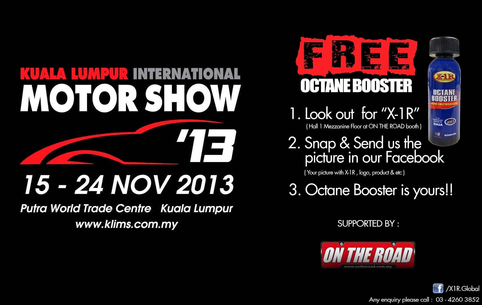 Visitors who make it to the KLIMS13 should find their way to the On The Road exhibition booth to get a FREE bottle of X-1R Octane Booster. After all, you do have to pay to get into the exhibition, so the Octane Booster really makes it worth your while. Just follow the simple instructions in the poster below: