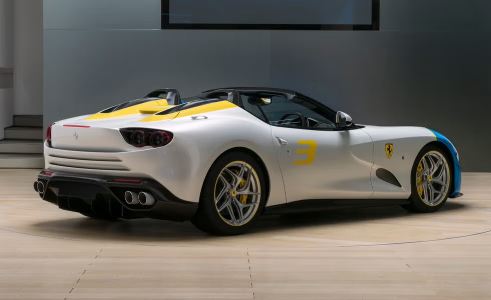The client’s ‘passion for Pop Art’ is reflected in its colour scheme, and the unique combination of the Azzurro Met (blue) and Giallo Modena livery over the main Bianco Italia colour scheme underlines the car’s sensual volumes.