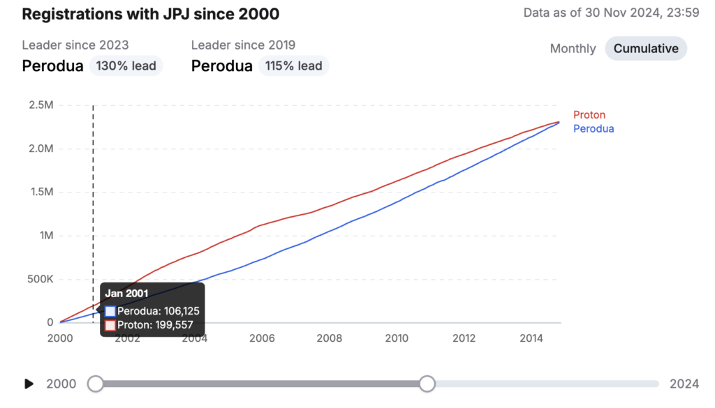 The data collates JPJ registrations from January 2000 of Peroduas overall with Protons on the road and cumulatively by the end of 2000, Proton had a significant lead over the Perodua.
