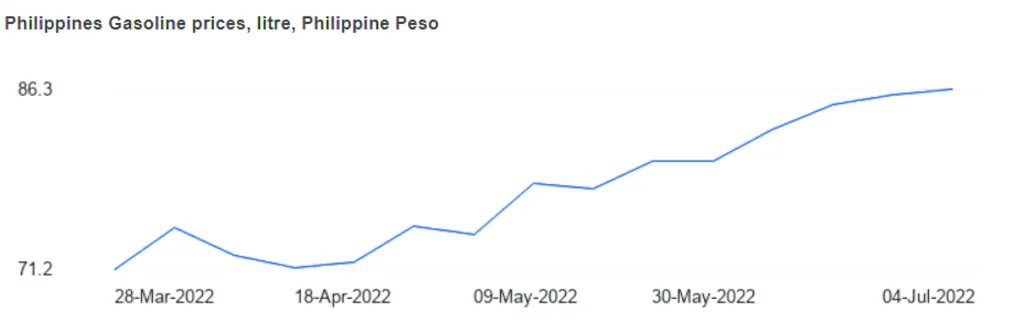 Seen on the graph below is the increasing trend of the fuel prices from March to July this year. In January this year, fuel prices range only from 50 up to 60 pesos per litre but today… an astonishing 80 to 100 pesos per liter!