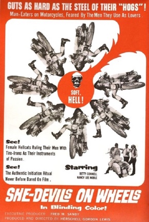 She-Devils on Wheels is about a gang of Harley-riding ladies known as the Man-Eaters. These “hardcore” women ride around in pastels and Capri pants (shouldn’t they ride Vespas, instead?), race to win men, and cause trouble in small towns.