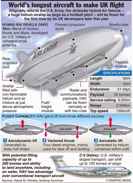 I could take a long time to write an explanation of why it is called a Hybrid Air Vehicle but this clever graphic from GRAPHIC NEWS does it so much better. Please take the time to visit their website.