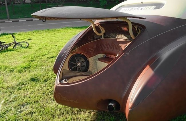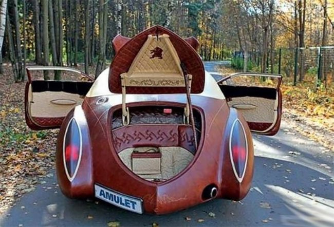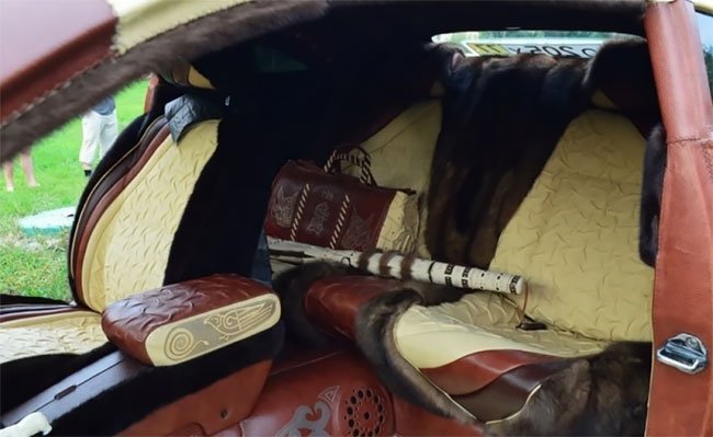 The whole outer body is covered in Canadian buffalo leather and inside is upholstered in Siberian weasel leather. Sable fur—supposedly the most expensive fur in the world—is used to trim the seats.